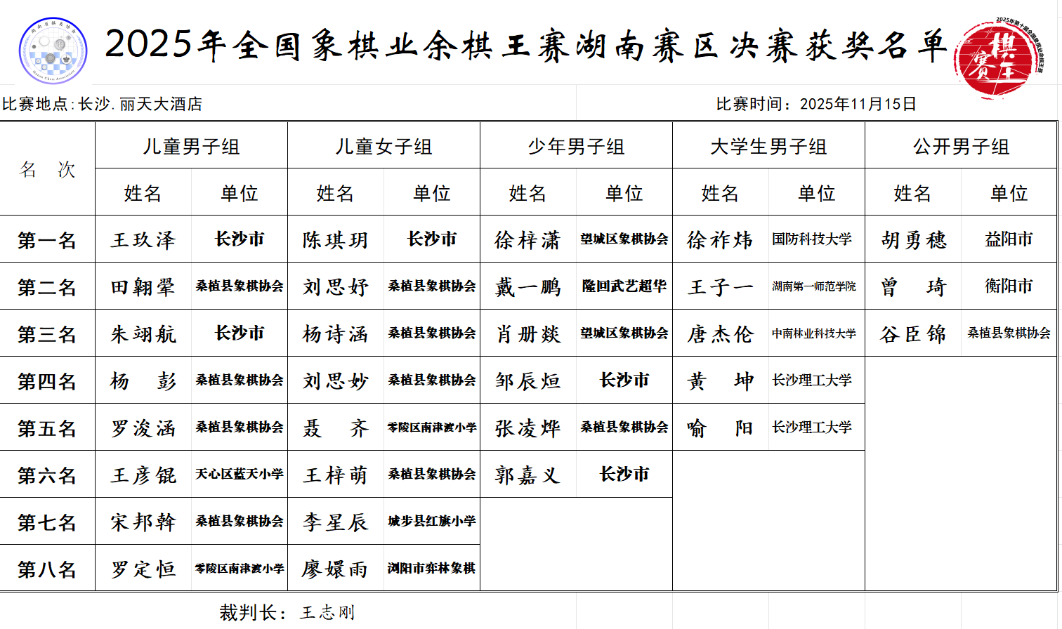 经过一天七轮的激烈角逐,各组别名次均已产生。儿童男子组方面,王玖泽(长沙市)获得冠军,田翺翚(桑植县象棋协会)、朱翊航(长沙市)分获第二、三名。儿童女子组中,陈琪玥(长沙市)摘得桂冠,刘思妤(桑植县象棋协会)、杨诗涵(桑植县象棋协会)位列第二、三名。少年男子组冠军由徐梓潇(望城区象棋协会)获得,戴一鹏(隆回武艺超华)、肖册燚(望城区象棋协会)分获第二、三名。