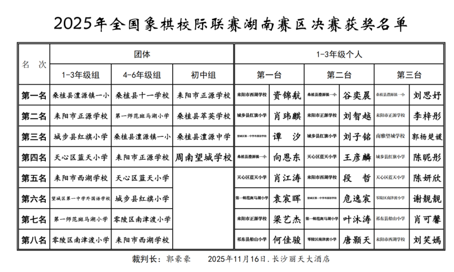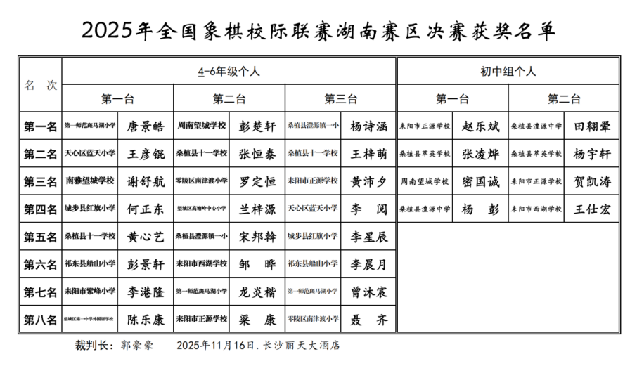 2025年11月16日,由国家体育总局棋牌运动管理中心、中国象棋协会指导,湖南省棋类协会主办,长沙市望城区弈星棋艺俱乐部承办的2025年全国象棋校际联赛湖南赛区决赛,于长沙丽天大酒店圆满落幕。赛事吸引了来自全省多所中小学的学子齐聚一堂,展现了湖南青少年象棋运动的蓬勃生机。